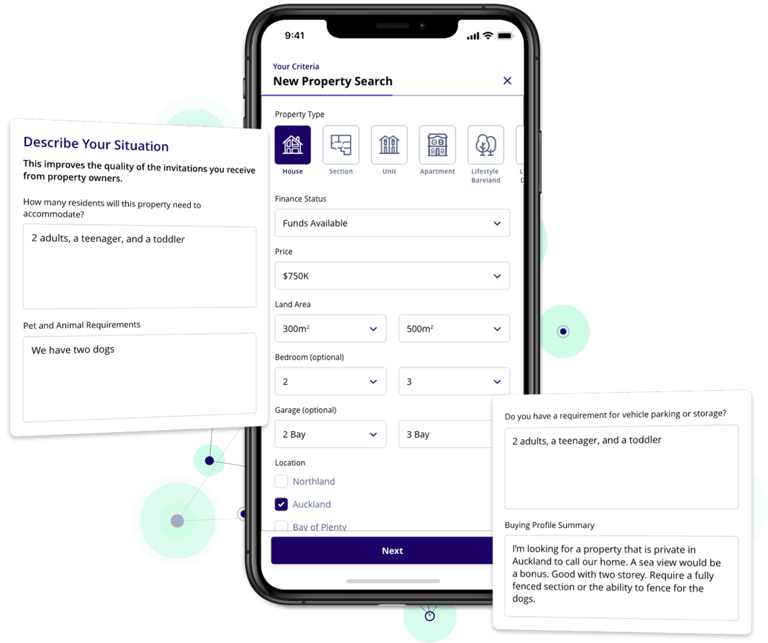Enter specific criteria, such as price, location, size, style, rooms, parking, proximity to schools and shops, and more. Instantly match with homes tailored to your needs. Become part of the exclusive buyers database accessing properties before owners spend thousands taking them to market.
